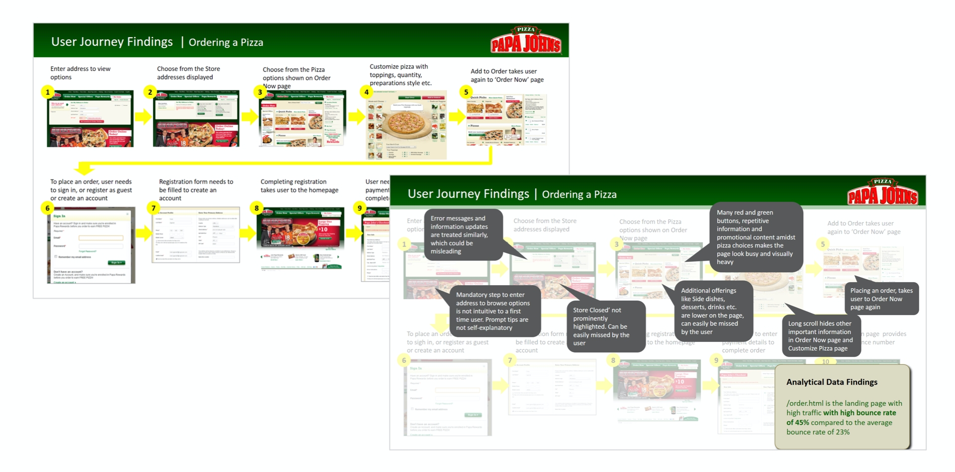 We mapped the end-to-end user journey across key stages of the pizza ordering experience, integrating insights from digital analytics data. This approach provided a comprehensive view of user behaviors, friction points, and opportunities for optimization, ensuring a seamless and engaging ordering process across web and mobile platforms.