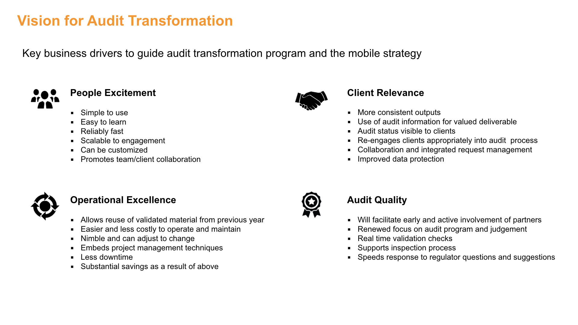 The engagement aimed to establish a structured approach for leveraging mobility in audit transformation. Key objectives included: