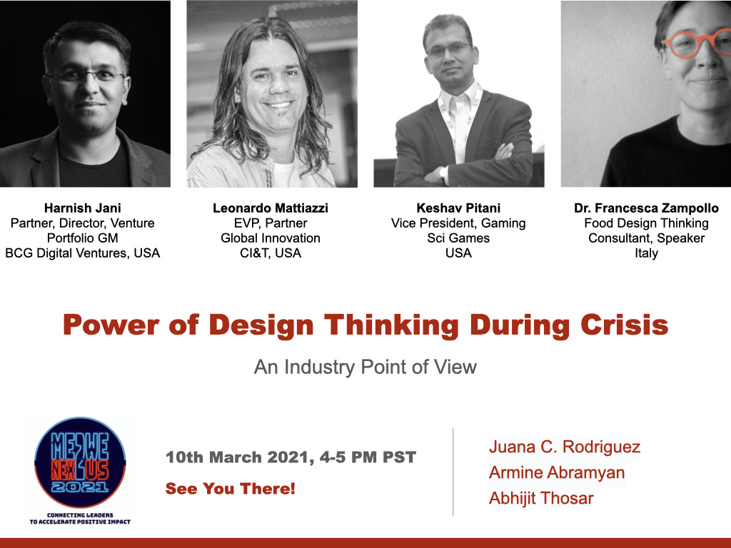 In March 2021, I organized and moderated a panel of industry experts on Power of Design Thinking During Crisis. This session was part of annual 3-day conference Me2We organized by Stanford University Graduate School of Business LEAD program participants. The conference is attended by over 400+ participants from 35+ countries.