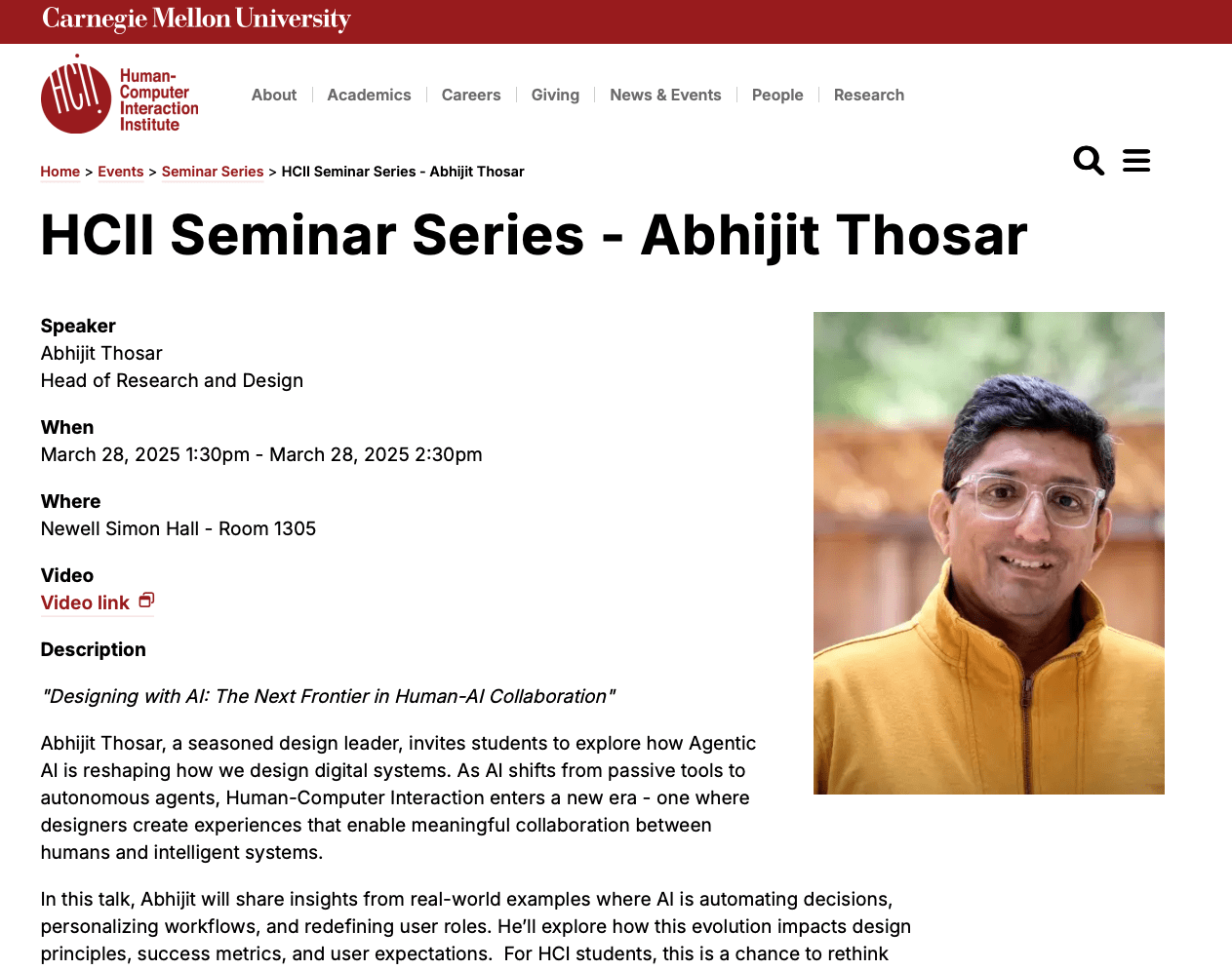 In Mar 2025, I was invited by Carnegie Mellon University, HCI Institute to speak to the under-grad, grad and PhD students on designing with and designing for AI.